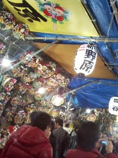 The charms and baskets of leaves with little plastic golden owls peering out at you surrounded by husks of wheat and fat little smiling geisha looking dolls all of them further surrounded by green leaves and glitter and cards with Japanese writing were visually very intriguing. I had to ask one of the older vendors what all this was about and simply put he replied beaming, 2 front teeth missing, his face a red glow from the sake he and his co-workers were happily consuming in copious amounts, “LUCKY!” he says, “BIG LUCKY!”