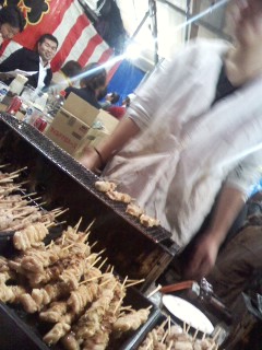 We were just kind of hanging around a corner of the festival near a Yakitori tent and I was having a beer and we were commenting on how cool and fresh all this was when apparently, the girl working seating who had thought we were in line for a spot tapped me on the shoulder and motioned for us to pop a squat at the grill counter. Fumi (my friend) and I exchanged looks and then sat down. grilled fish, veggies and some other goodies I honestly could not identify were ordered and we found out that all the staff including our grill master “Hiro” were all college kids working this part time gig. All of them slamming beers and clearly having a good time.