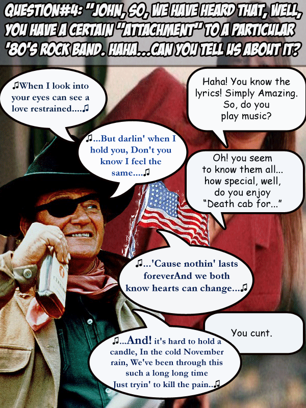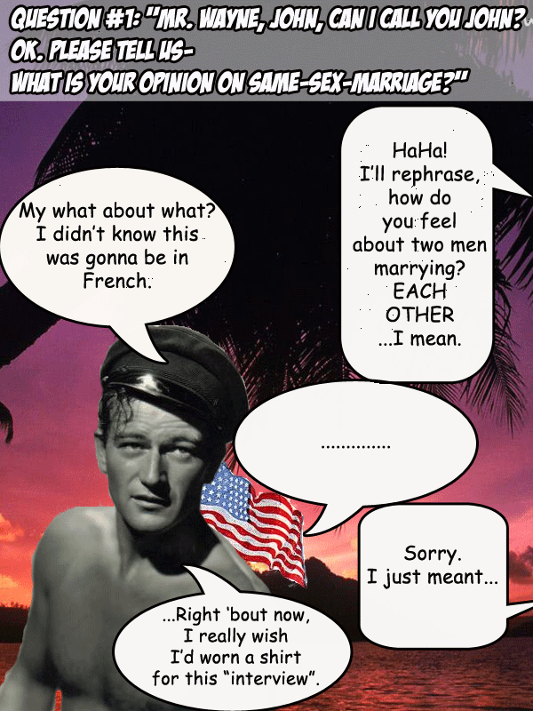 My excitement can be contained no longer. I am honored to present to you, this totally original and in no way altered, or contrived, interview with, none other than the “DUKE” himself; John Wayne.