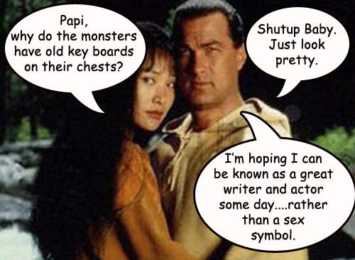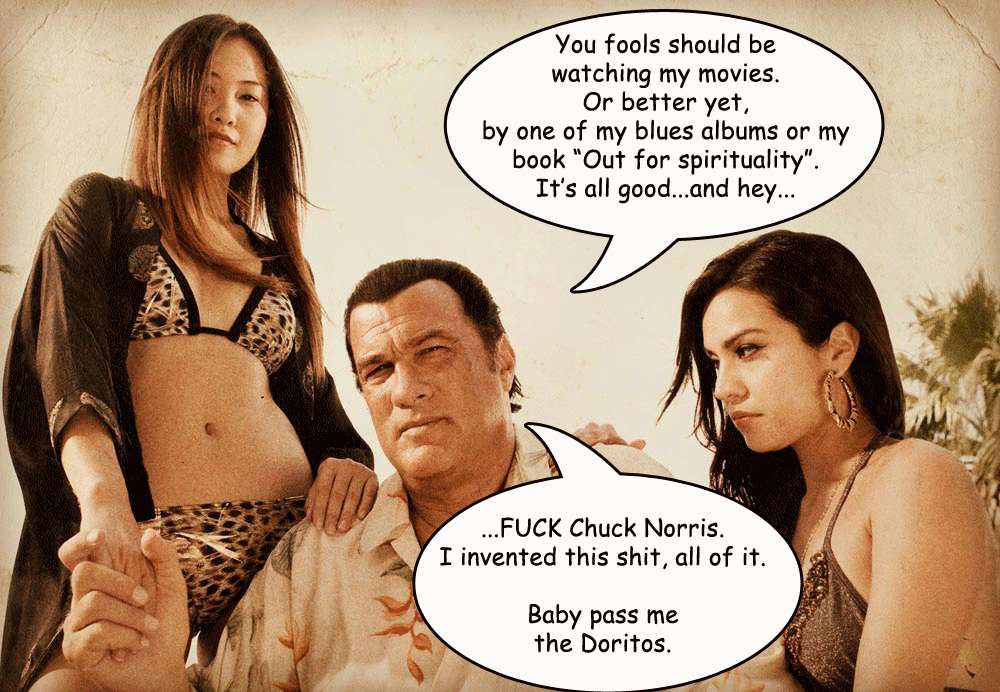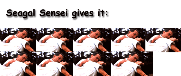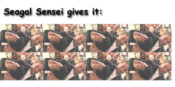 OH and I bet Sensei Segal has a “bone cracking” sound gadget in his writs, it works like a clicker, isntead of counting, it just makes an automatick bone cracking sound with every move he makes…he walks BOOM bone cracking sound…thats why he doesn´t move much during productions! HAHAHA