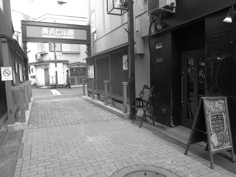 The only people I saw that afternoon in the area were two girls, early 20’s, sharing a bag of Japanese fried chicken just at the entrance to the street. Across the street thirty people shivered in line waiting to go into a franchise ramen shop. Once I went under the arch of the street and entered, it was very quite and the only people I encountered, very senior citizens here and there; all drinking and sitting at tiny bars, gave me no more than a disinterested glance. This was fine with me. It seemed to fit somehow.