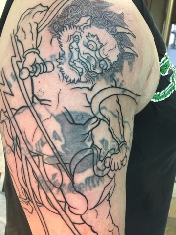 This is the face of Raijin, the Japanese, I mean by this Shinto, god of lightning and thunder. My first visit to the shop, Horimitsu explained the process would be partly done with a tattoo gun, so Yobori style and the color, for example the leaves falling and the lightning bolts, would be done the old way or Tebori style. So, we began with the gun, it makes the lines darker and the work is done faster. The first session was three hours and you can see, we began to cover up some of my other tattoos.